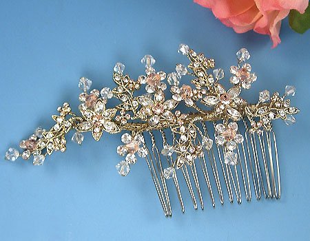 A stunning bridal comb handmade with 14 kt. gold wire. This comb boasts amazing color and texture with a beautiful floral design encrusted with clear and champagne colored Austrian Crystals. This stunning bridal comb coordinates best with ivory, light ivory and champagne colored wedding dresses. The spectacular rhinestone detailing measures approximately 4 1/2 inches along a 2 inch metal comb. Read More...Wedding Bridal Comb, Gold with Champagne Crystals 740G Technical Details